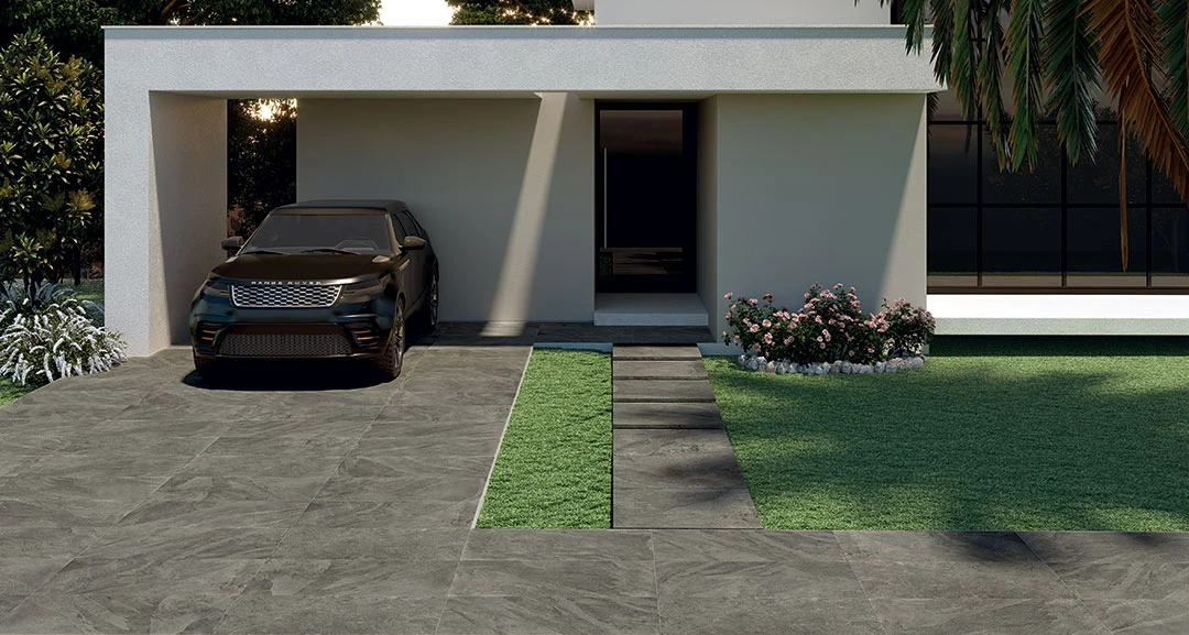 Here is the Riverstone Piombo tile in its robust 2cm variant, perfect for outdoor use. Install this tile with the 10mm variant of the product to create an indoor application of the tile. You can find this product range here. Buy your Riverstone Piombo tiles today.