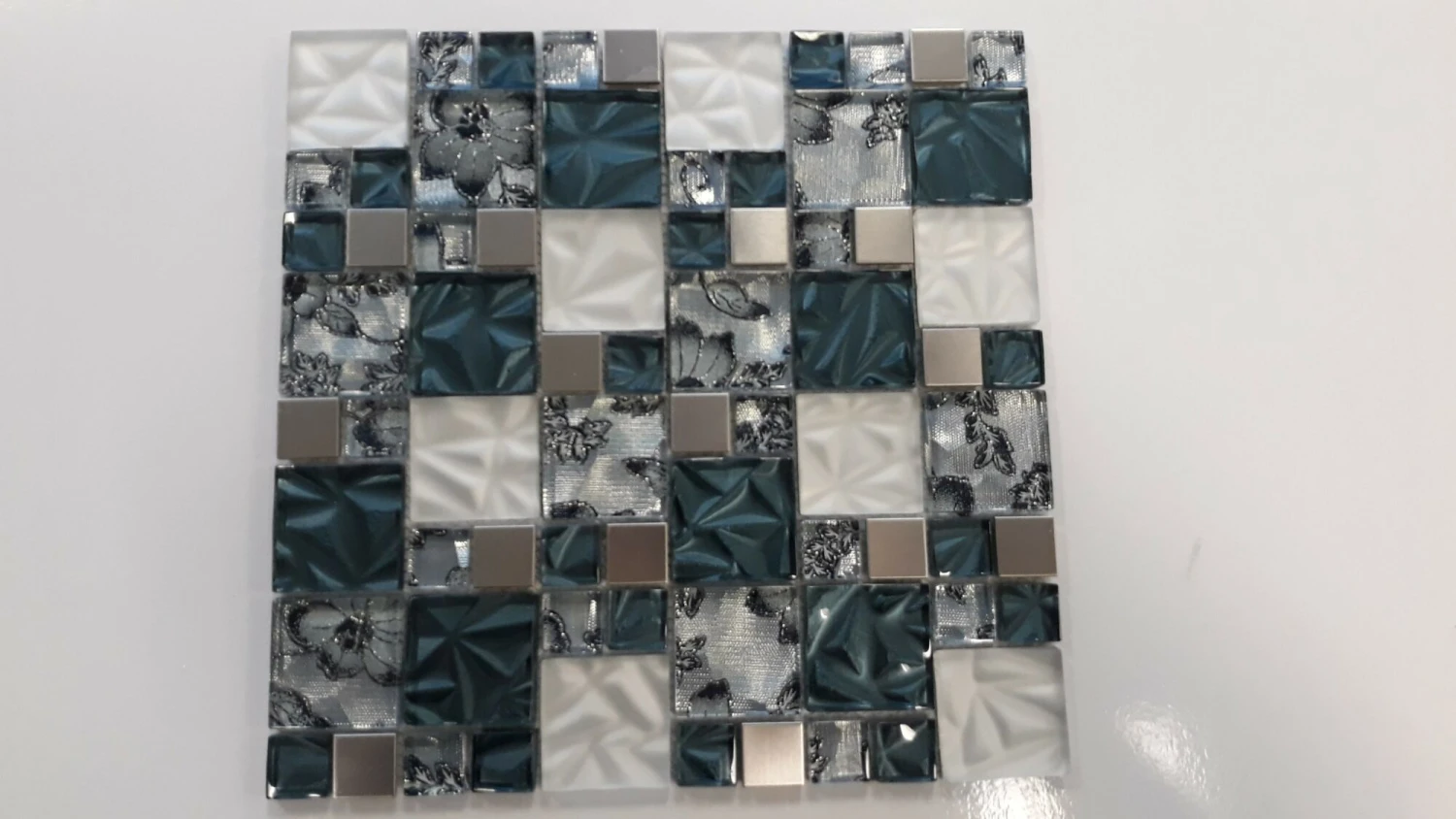 The unique design of the Textile Blue Silk Square offers an array of designs and textures and is a very interesting and alluring piece. The beautiful blue, silver and ivory tones and textures of various textiles is a popular choice for any bathroom, wet room or kitchen wall.